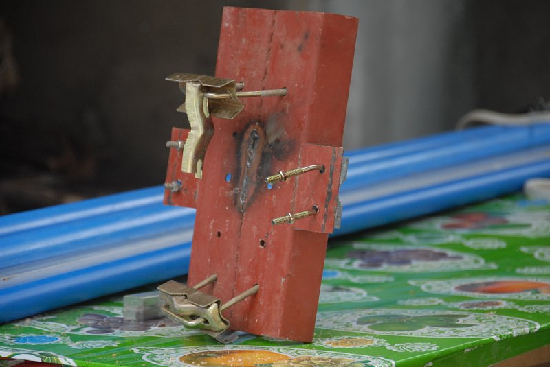 | こちらがブーム側のUボルト これはテレビアンテナ用なので何処にでも売っています。 とにかく「無ければ作る」、これがフィリピン流です ちなみにこの溶接加工で100ペソ(200円)ですから安い それでもGigiは200ペソ(400円)の溶接屋さんが高いからと安いところを探してきました ![]() |
